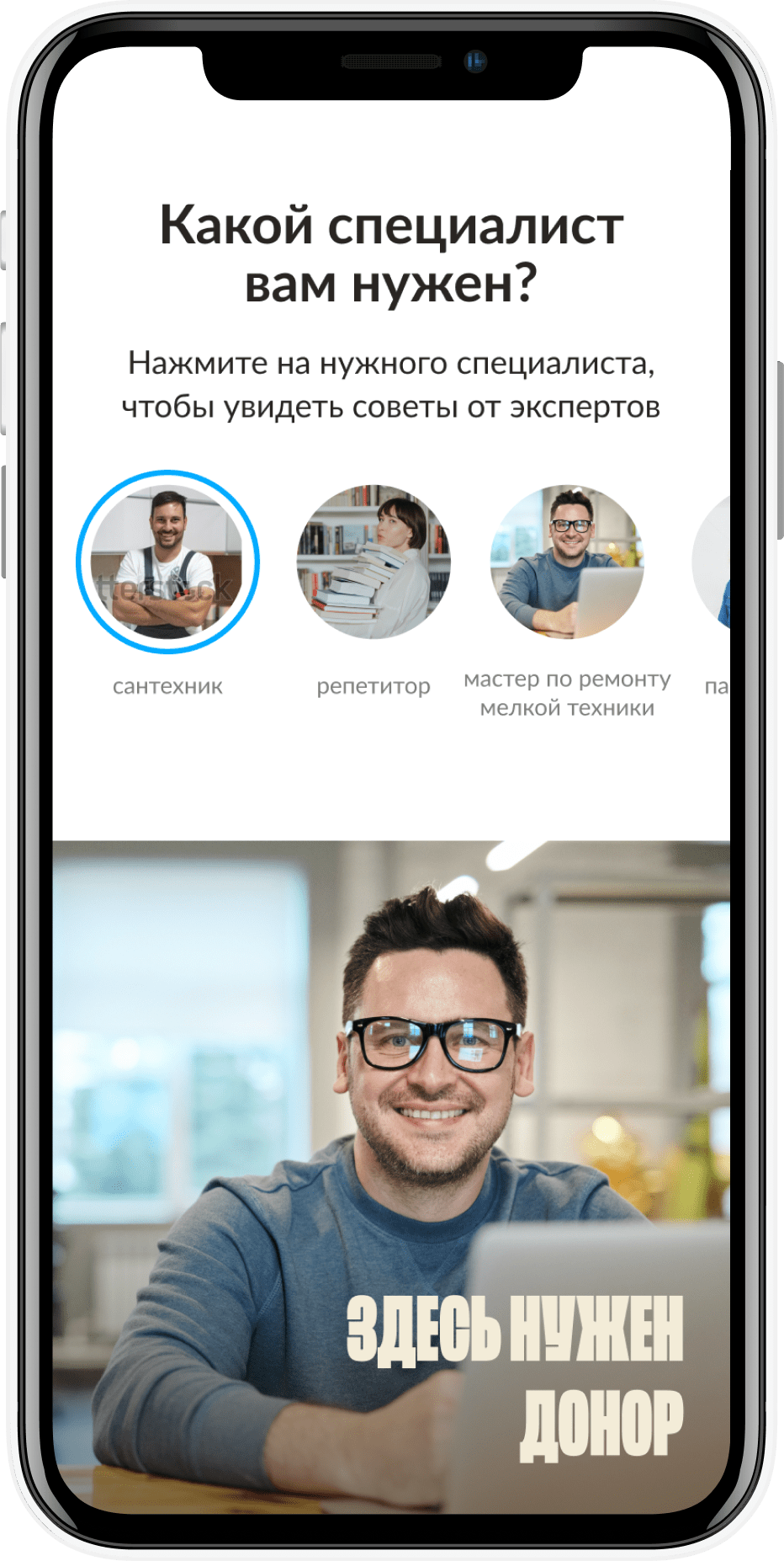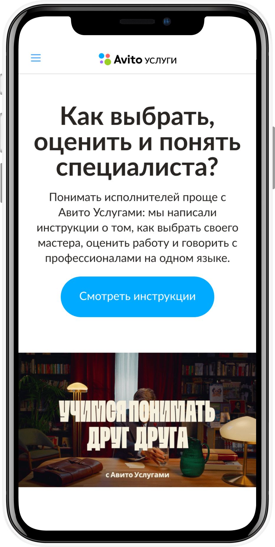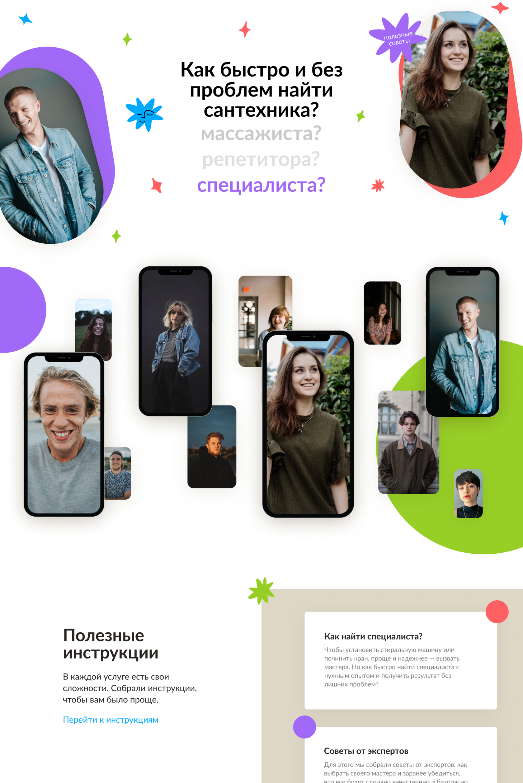 Лендинг для проекта Авито Услуги с понятными инструкциями о том, как выбрать своего мастера, оценить работу и говорить с профессионалами на одном языке. Создали удобную и привычную навигацию по специалистам в виде сториз