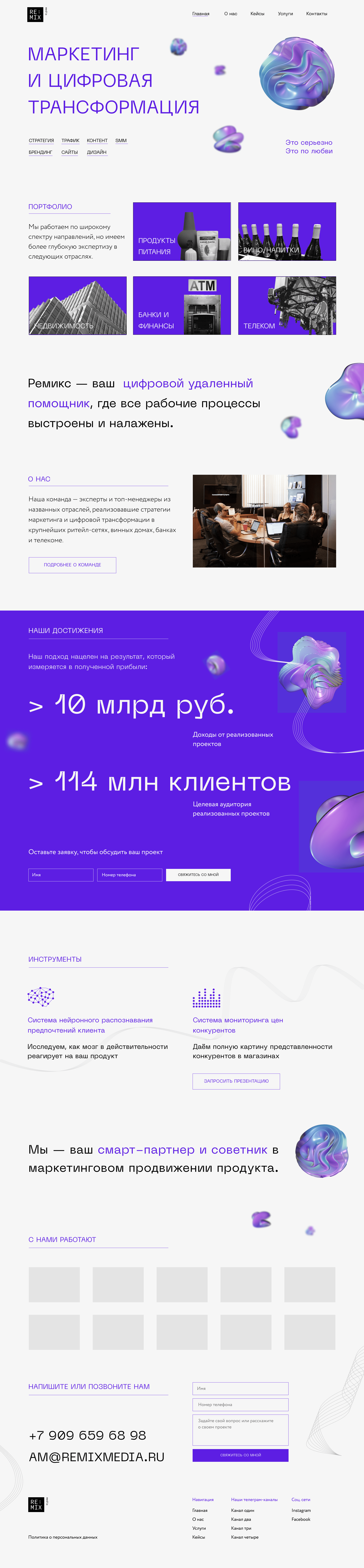 Многостраничный сайт для маркетингового агентства Ремикс Медиа. Для удобства просмотра большого количества объемных кейсов, мы создали кастомизированную систему табов кодом. Это позволило удобно находить кейс для конкретной ниши